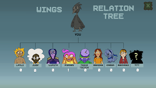 And the last concept was for the relations tree. For this one, I decided it would be fun to turn it into a family tree, because the Bird-in-Trainings in Tag World are really adamant about calling their Wings family, so I thought it'd fit really well into that, and it could further incorporate the theme. When you click on a character, it would pop up with another box with more details so the family tree could be limited to just the points you have with them.